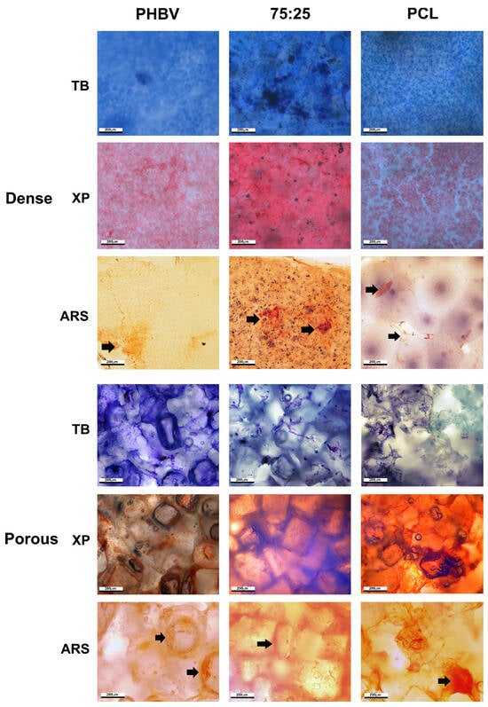 Cytochemical and osteogenic differentiation of mesenchymal stem cells (MSCs) cultured on dense and porous polymers for 21 days, as assessed by alizarin red staining (ARS). Black arrows indicate ARS marking. TB = Toluidin Blue at pH 4.0; XP = Xylidine Ponceau at pH 2.5; ARS = Alizarin Red Staining. Scale bar = 200 μm.