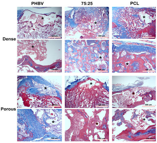 Histological analysis of the experimental groups stained with Masson’s trichrome. Asterisks indicate the implant site. Scale bars = 100 μm and 500 μm.