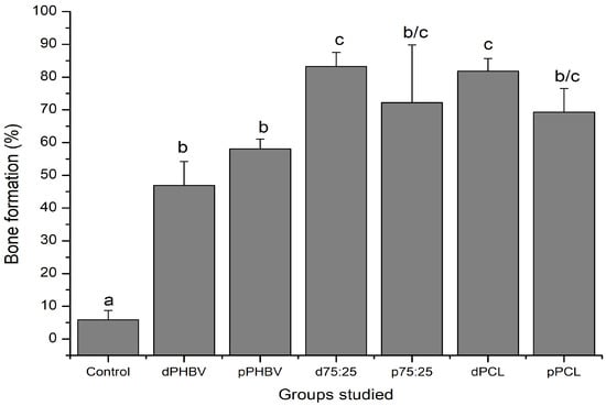 Morphometric analysis of bone formation (%) across experimental groups. Different lowercase letters indicate significant differences among groups (one-way ANOVA and Tukey’s post-test, p < 0.05). Control (G1); dPHBV = dense PHBV (G2); pPHBV = porous PHBV (G3); d75:25 = dense 75/25 blend (G4); p75:25 = porous 75/25 blend (G5); dPCL = dense PCL (G6); pPCL = porous PCL (G7).
