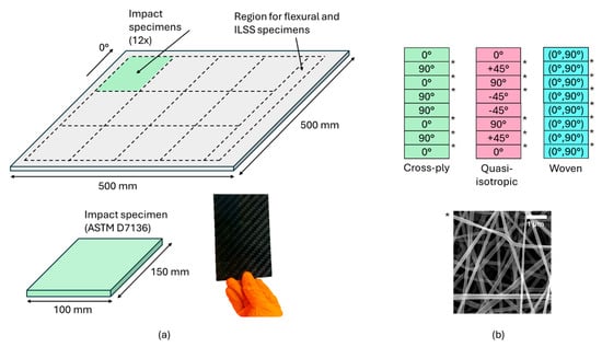 (a) Geometry of the manufactured composite plates and the specimen layout. (b) Nanofiber veils are interleaved between the reinforcing plies of three configurations (interlayers marked with ‘*’), resulting in toughened composites.