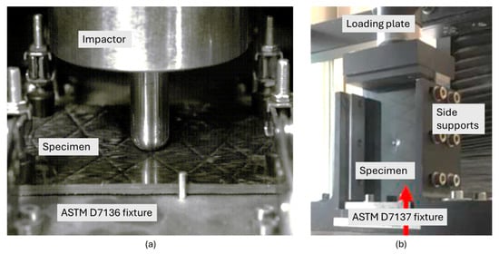 (a) Still image taken by the high-speed camera during the low-velocity impact test according to ASTM D7136. (b) Compression-after-impact testing according to the ASTM D7137 [42] standard.