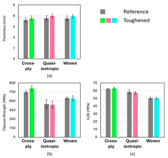(a) Thickness, (b) flexural strength, and (c) ILSS of the produced composite laminates for both the reference configuration (without nanofibers) and the nanofiber toughened configuration.