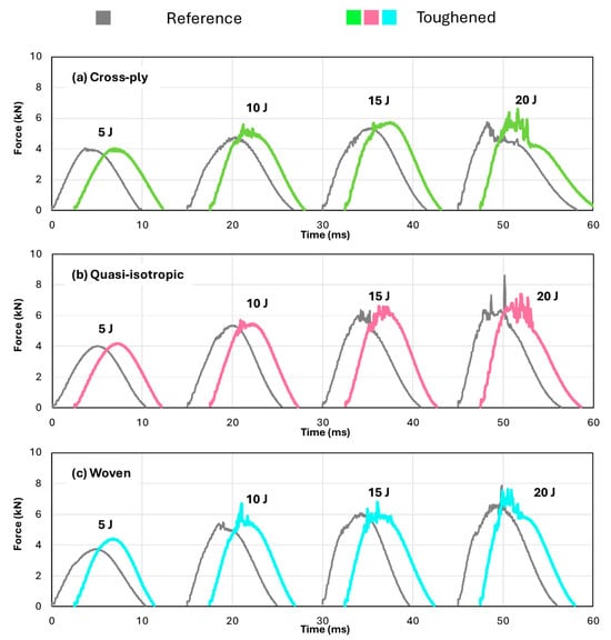 Representative force versus time curves of the impact tests on reference (in grey) and toughened (in color) specimens. The curves are offset on the time axis for illustration purposes only.