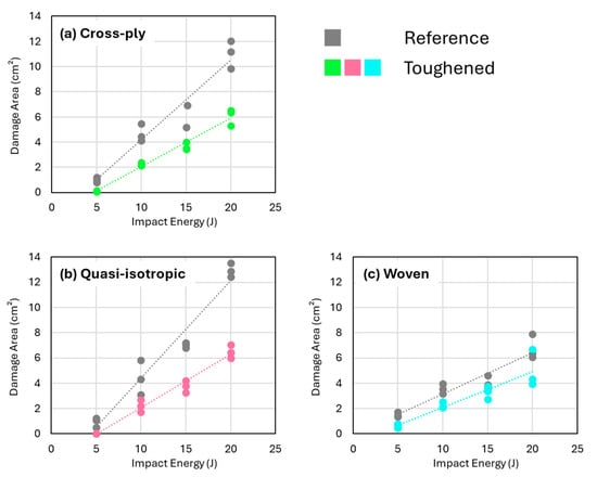 Projected damage area versus impact energy for (a) cross-ply, (b) quasi-isotropic, and (c) woven composites show a clear reduction in damage area upon interleaving the composites with nanofibrous veils. A linear fit is plotted for illustration purposes.