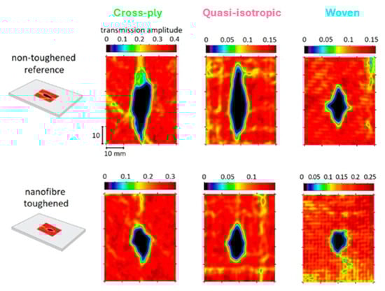 C-scan images of the different specimens impacted at 20–25 J showing a rhombus-like projected damage area with a clear reduction in projected damage area for the toughened specimens.