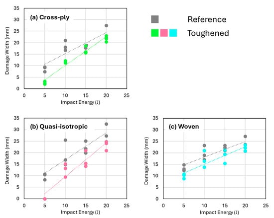 Damage width versus impact energy for the (a) cross-ply, (b) quasi-isotropic, and (c) woven configurations. The difference between toughened and reference specimens is less extensive in comparison to the projected damage area.