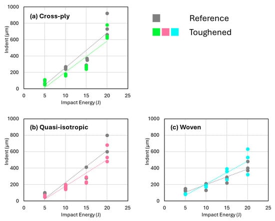 Indent depth versus the impact energy for (a) cross-ply, (b) quasi-isotropic, and (c) woven impacted specimens. No significant differences are observed between reference and toughened specimens.