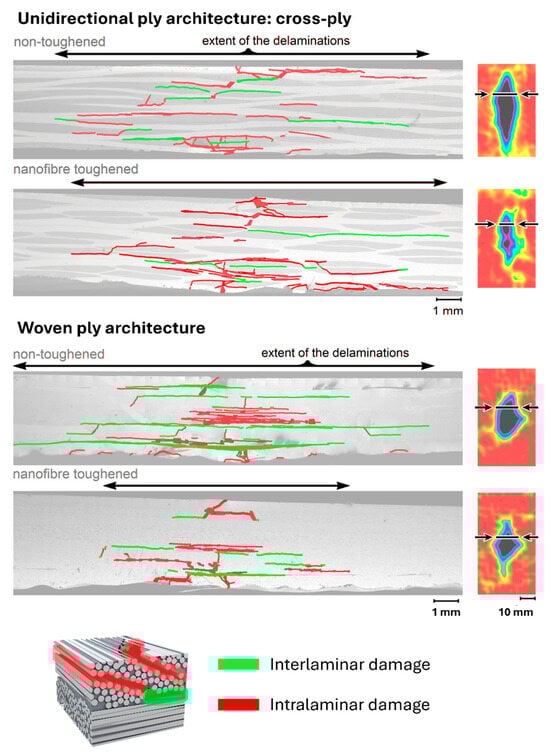 The differing impact behavior between woven fabric-reinforced composites toughened with nanofibers and multidirectional architectures composed solely of unidirectional plies can be attributed to the distinct nature of the damage profile in these composites. In woven fabric composites, as discussed in relation to Figure 9, nanofiber toughening effectively reduces both interlaminar and intralaminar damage. In contrast, in multidirectional lay-ups, the nanofibers primarily reduce interlaminar delaminations while leaving the degree of intralaminar damage largely unchanged. A possible explanation for this is that in the samples with unidirectional plies, the toughening effect of the nanofibers leads to localized absorption of the impact energy, initiating other damage mechanisms, such as fiber fracture and transverse cracking in the intralaminar regions, ultimately leading to a CAI lower than expected. For the woven specimens, the projected damage area decreases to a lesser extent than for the other configurations; however, both interlaminar delaminations and intralaminar damage are reduced more uniformly.