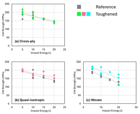 CAI strength versus impact energy for the (a) cross-ply, (b) quasi-isotropic, and (c) woven configurations. Only for the woven specimens a significant increase in CAI strength is observed.