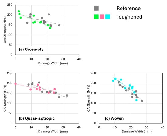 CAI strength versus damage width for the (a) cross-ply, (b) quasi-isotropic, and (c) woven specimens.