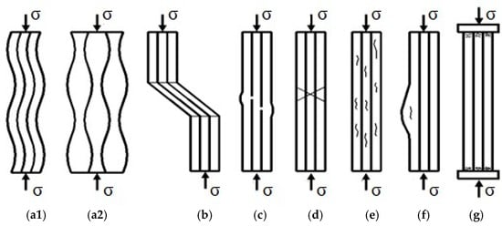 Compressive failure modes of fiber composites. (a1) Elastic micro buckling—in phase (shear microbuckling); (a2) Elastic microbuckling—out of phase (extensional microbuckling); (b) Fiber kinking; (c) Fiber crushing; (d) Shear band formation; (e) Matrix cracking; (f) Buckle delamination; (g) Contact damage [11,12,13].