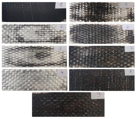 The GFRP plate was procured from the manufacturer “SC. Compozite Brasov SRL” (Romania) [10]. The manufacturing stages of the GFRP board were provided by the manufacturer and are described below. The composite plate was produced using the lay-up method. The first step consisted of selecting an unlaminated particleboard, which was cleaned, dried, and degreased with diluent. In order to avoid the sticking of the bottle fibers to the chipboard, 3 layers of liquid wax-based release agent were applied alternately. Each layer of release agent was left to dry for 20–30 min according to the manufacturer’s instructions, and finally, a finishing process was carried out. In the second step, the resin and hardener were weighed and then mixed together until homogenized. In the next step, each fiber layer was stacked and impregnated in the resin. A metal roller with circular channels was used to remove excess air between the fibers and the resin. The polymerization of all layers lasted for 24 h at a temperature of 20 °C. The last step included the detachment of the fiberglass composite board from the chipboard using plastic devices. The final result was a composite board composed of 9 layers with the fiber orientation at [0°/90°]. Figure 2 shows the fiberglass layers after the application of the complete combustion method, as indicated in ASTM D 2584. The GFRP sample (before combustion) and the fiberglass layers (after combustion) were weighed using an analytical balance. The fiberglass content (by weight) was 54.4%, and the epoxy resin content was 45.6%, as determined by this method.