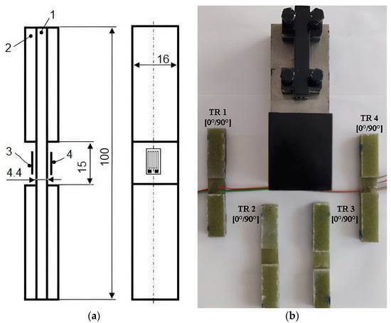 The mechanical behavior was analyzed during the compression test on a universal testing machine, type INSTRON 8801, which develops a maximum force of 100 kN. The tests were performed at room temperature, and the test regime was determined by a strain growth rate of 0.5 mm/min for each specimen. Due to the low speed of displacement during the tests, it was possible to observe the deformations occurring, thus obtaining a good accuracy in drawing the characteristic curves for specimens TR 1, 2, and 3. The compression tests were performed according to the modified ASTM D 695 standard (Boeing method) for specimens with [0°/90°] fiber orientation. The four specimens tested were cut in the transverse direction (TR) from the initial plate. In order to obtain the Young’s modulus, two unidirectional strain gauges of type EA-13-240LZ-120, manufactured by Micro-measurements, with a resistance of R = 120 Ω ± 0.3% and a mark factor of kG = 2.095 ± 0.5%, were bonded to the TR 4 specimen. Under these conditions, the testing took place in the elastic range, both tensile marks bonded in the longitudinal direction measured the specific longitudinal strain, ԐL. In Figure 3a, the following notations were made: 1—specimen; 2—tabs; and 3 and 4—strain gauges bonded on both sides in the calibration area. Figure 3b shows the device and the specimens for the compression test, according to ASTM D 695 (Boeing method).