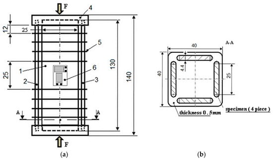 (a) Specimen for Poisson’s ratio determination (back GFRP sample not shown): 1—front sample; 2—left sample; 3—right sample; 4—Al alloy shell; 5—Al-sheet spacer; 6—T-type T-strain gauge; (b) Section A-A.