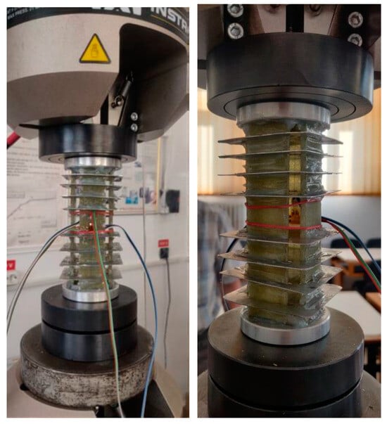 The aluminum alloy caps are 10 mm thick. Channels 4.5 mm deep were made in the caps, arranged as in the spacer shown in Figure 4. The ends of the four samples were inserted into these channels. The samples were fixed to the caps and spacers with adhesive. Thus, by arranging the four specimens along the sides of a square, the moment of inertia of the cross-section of the specimen was increased, and the spacers were used to decrease the buckling length (the buckling length remains longer only in the central part of the specimens where the strain gauge is mounted). On both sides of the front sample, two strain gauges of type CEA-06-125WT-120, manufactured by Micro-Measurements, with resistance R = 120 Ω ± 0.35% and brand factor kG = 2.025 ± 0.5%, were glued to both faces. The four rosette grids were connected to a Vishay P3 tensiometer bridge (quarter-bridge mounted). The test specimen was placed between the platens of an Instron 8801 (Figure 5) testing machine, interspersed with a hemispherical hinge, to accommodate any deviations from parallelism between the upper and lower surfaces of the two covers. Loading of the specimen was conducted in the elastic range at a speed of 0.3 mm/min, up to a force of 8.2 kN for a single specimen. Force–displacement diagrams of the machine traverse and output signals from the four grids of the tensile rosettes were recorded during the test.