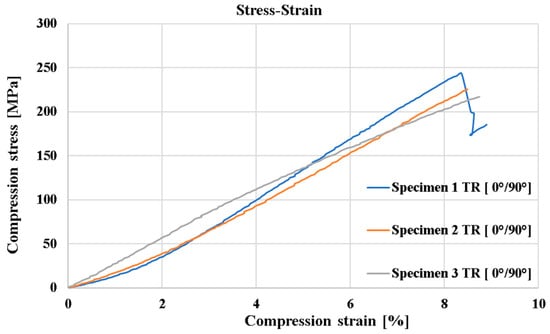 Figure 6 shows the compressive behavior of GFRP-RT 500 specimens with [0°/90°] fiber orientation for the first compression test following the modified ASTM D695 standard (Boeing method). In the case of the three curves, it can be observed that the highest stress occurs at specimen 1, having the maximum value of σr = 243.23 MPa. By analyzing the appearance of the three plots, it can be observed that a sharp drop occurs at specimen 1 at a stress of about 240 MPa, which indicates a sudden breakage of a larger number of fibers. Similar diagrams have been obtained by other researchers [20].