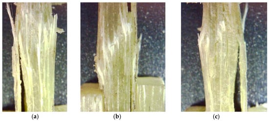 In the transverse cutting direction, noted as TR in the plate with fiber orientation [0°/90°], the types of breakage and failure modes were analyzed. These aspects complied with the typical failure codes/modes of the ASTD 3410/D 3410M—03. For specimens 1 and 3, the code BGM (brooming gage middle) wass used, and for specimen 2, the code was HAT (through-thickness at tab top), as shown in Figure 7.