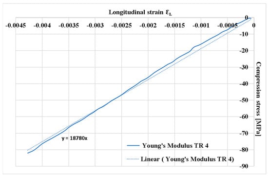 Figure 8 presents the normal stress (σ)/specific longitudinal strain (εL) coordinate plots of the longitudinal modulus of elasticity, E (Young’s modulus), for the plate specimens TR4 with orientation [0°/90°]. Young’s modulus was determined as the slope of the approximation line of the plotted normal stress (σ)/specific longitudinal strain (εL) coordinate plot through the points determined from the Instron 8801 force values and specific longitudinal strain records. Points located at low force values (influenced by the initial clamping processes in the machine’s bores) and points located at high force values, for which no strain recordings were made with the P3 bridge, were removed from the graph, as detachments of the tensiometer rosette and distortions of the strain recordings occurred.
