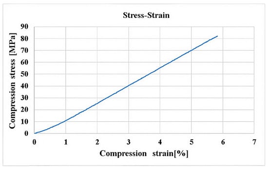 Figure 9 shows the stress–strain curve for a specimen subjected to compression, which represents the second test method in this research. The stress was within the elastic range; the curve is linear in appearance.