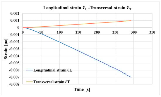 The slope of this line, taken in absolute value, is the Poisson’s ratio. For the studied GFRP, the Poisson’s ratio ν = 0.1427 was obtained in compression. For the tensile test of cross-cut specimens from the same GFRP, ν = 0.1 was obtained [21].