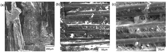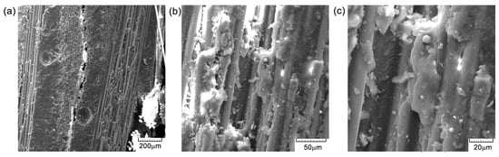 SEM images of the surface material—GFRP-specimen TR2: (a) 200×; (b) 500×; and (c) 1000×.
