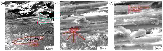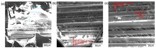 Figure 12, Figure 13 and Figure 14 illustrate several characteristics of the specimens under investigation that were subjected to compression tests at different levels of magnification. In Figure 13b,c and Figure 14, visual examination of the sample surface morphology reveals a uniform alignment of fibers within the matrix, with the presence of small voids at the fiber–matrix interfaces caused by the manufacturing and solidification processes of the epoxy resin. The adhesion of the fibers to the resin is thus deficient and can lead to decreased mechanical properties. The matrix exhibits attachment to the fibers, with very few cases of separation, as seen in Figure 13a and Figure 14a. The presence of microcracks (Figure 13a) or voids (Figure 13c), together with areas of weaker adhesion of the fiber matrix (Figure 13c), contributes to the initiation of composite damage and premature failure. The presence of these defects may also be due to the process of obtaining the composite material, particularly at the resin introduction stage. The composition of the material results in the formation of a robust substance that exhibits enhanced load-bearing capabilities [22], thus indicating a significant degree of impact resistance. The observed surface orientation of the tested fibers ranged from [0°/90°], with a notable failure occurring at 45 degrees (Figure 14b), indicating ductile behavior.