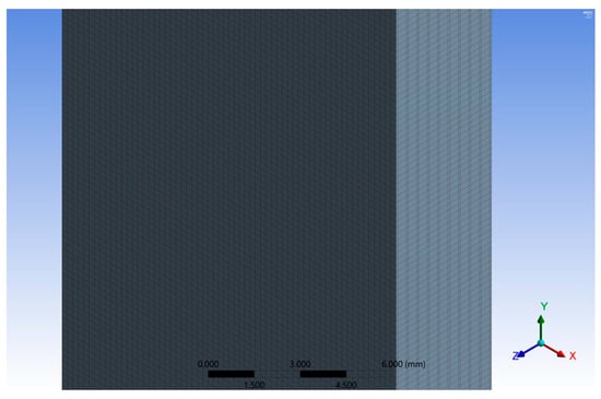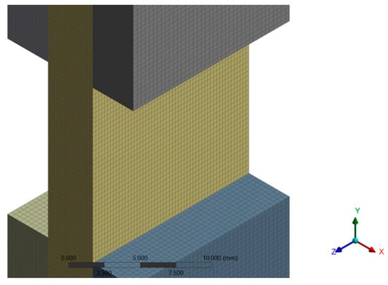 The discretization network consists of prismatic elements with a maximum size of 0.4 mm, which is the maximum size of the reinforcement layer shown in Figure 27. The discretization network is quantitatively characterized by a total of 505,260 nodes and 471,200 elements, and qualitatively, it is an excellent network according to the quality parameters (orthogonal quality, skewness, and aspect ratio).