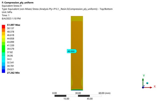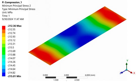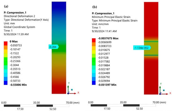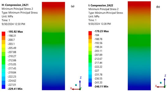 An average compressive strength of 228.62 MPa was experimentally determined (Table 1). Under the same loading conditions, a stress of 212.36 MPa was found by FEA (Figure 21). The relative error between the above two stresses is 7.11%. For a stress of 80 MPa, a strain of −0.0042 (Figure 8) was measured with a strain gauge, and −0.0044 was determined using FEA (Figure 22). The strain value provided by FEA has a relative error of 4.5% compared to the measured value. These errors are acceptable for the engineering field and validate the correctness of the FEA.