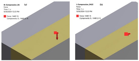 For these cases, only the specimen without tabs was used. The same force of 14,481 N was applied to its upper surface, oriented toward the negative side of the Y-axis (compression), and the specimen was embedded in the lower part.
