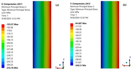 Figure 24a and Figure 24b show the minimum principal stresses σy in the mid-section of the specimen for force eccentricities of 0.2 mm and 0.4 mm, respectively, in the OZ direction. It can be seen that bending of the specimen also occurs due to the eccentrically applied force. When the force moves in the direction of the OZ axis, the neutral axis is parallel to OX, and when it moves in the direction of OX, the neutral axis is parallel to OZ (Figure 24a,b; Figure 25a,b).