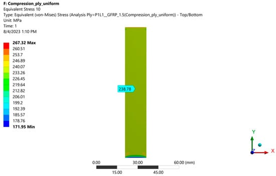 von Mises stresses in the middle of layer 10 (fiberglass fabric, which contains the plane of symmetry of the specimen).