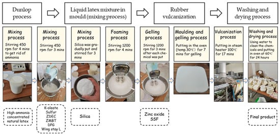 Mixing process: Natural rubber was added into the stirring machine, stirred for 4 min to remove the ammonia, which is essential for improving the viscosity and stability of the latex and facilitating better foam expansion. Afterward, the other ingredients consisting of K-oleate, sulfur, zinc Diethyldithiocarbamate, zinc 2-mercaptobenzothiazole, Wingstay L, and diphenyl guanidine were added and stirred for 3 min. These ingredients were included to enhance the crosslinking and stability of the rubber matrix during the vulcanization process.