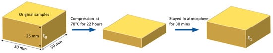 In the compression test according to the ASTM D3574 standard, the specimen size was 50 ± 1 mm (2-inch) square with a thickness of 25 ± 1 mm (1 inch). The samples were compressed by using a force transducer to reduce the thickness of the original sample to 50% and placed in an oven at a temperature of 70 °C ± 1 °C for 22 h, then the samples were taken out of the oven and the transducer and stayed in the atmosphere for 30 min. Then, the thickness of samples was measured. Figure 2 shows the schematic diagram for the test of the compression set. Three samples of each type were tested and the average was reported. The thickness measured was calculated by using the following two equations [30,31]: