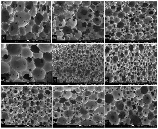 SEM image of natural latex foam (a) without silica, (b) with DM30 at 1 phr, (c) with DM30 at 2 phr, (d) with Aerosil R972 at 1 phr, (e) with Aerosil R972 at 2 phr, (f) with Aerosil 200 at 1 phr, (g) with Aerosil 200 at 2 phr, (h) with Sip22s at 1 phr, and (i) with Sip22s at 2 phr. SEM images of foam rubber at 50× magnification. A 100 µm scale bar is included for reference.