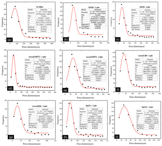 Average pores diameter of silicas (a) without silica, (b) with DM30 at 1 phr, (c) with DM30 at 2 phr, (d) with Aerosil R972 at 1 phr, (e) with Aerosil R972 at 2 phr, (f) with Aerosil 200 at 1 phr, (g) with Aerosil 200 at 2 phr, (h) with Sip22s at 1 phr, and (i) with Sip22s at 2 phr.