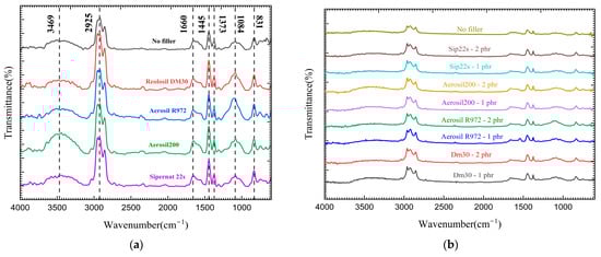 FTIR results of latex foam with different types of silica at 1 phr (a) and with different concentrations of silica (b).