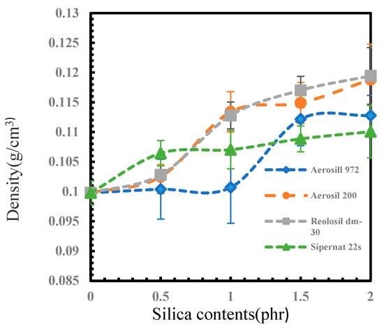 Figure 7 shows the densities of different types of silica with different contents. The density of the foam samples increased linearly with the increase in silica content for all types of silica. The highest density was observed for the samples containing 2 phr of Reolosil DM30 hydrophobic fumed silica (0.120 ± 0.005 g/cm3), followed by those with 2 phr of Aerosil 200 hydrophilic fumed silica (0.119 ± 0.006 g/cm3), then 2 phr of Aerosil R972 hydrophobic silica (0.113 ± 0.003 g/cm3), and finally 2 phr of Sipernat 22S precipitated silica (0.110 ± 0.004 g/cm3). The density of the non-silica foam rubber was 0.100 ± 0.002 g/cm3. The differences in density between the samples can be attributed to the ability of the silicas to create a finer and more uniform cellular structure, as observed in the SEM images. The higher the silica loading, the greater the reinforcement of the rubber matrix, leading to higher foam densities [42,43].