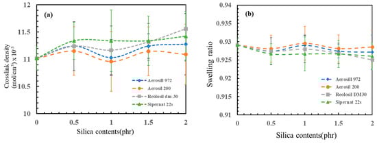 (a) Crosslink densities of different types of silica, (b) swelling ration of different types of silica.