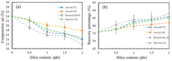 (a) Compression set of different types of silica; (b) recovery percentage of different types of silica.