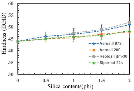 A comparison of different silica fillers revealed that the hydrophobic silica, particularly Reolosil DM30 and Aerosil R972, exhibited the highest enhancement in rubber properties compared to the hydrophilic silica, Sipernat 22S and Aerosil 200. At a concentration of 2 phr, Aerosil R972 and Reolosil DM30 demonstrated hardness values of 51.0 ± 2.0 IRHD and 52.0 ± 2.1 IRHD, respectively, while Sipernat 22S and Aerosil 200 exhibited hardness values of 48.5 ± 2.4 IRHD and 48.0 ± 2.4 IRHD, respectively. One significant factor contributing to this observation is the BET surface area of the silica fillers. Reolosil DM30, known for its hydrophobic nature, possesses the highest BET surface area among the tested silica fillers. The higher BET surface area allows for a greater number of active sites to be available for interaction with the rubber matrix, promoting stronger filler–matrix adhesion and ultimately resulting in increased hardness [38,53].