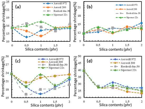 Percentage shrinkage of different types of silica compared with sides of sample: (a) width; (b) length; (c) height; and (d) height of center.