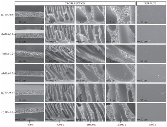 Morphologies of membrane samples. Cross-sectional images at both low and high magnification are displayed in the first to fourth rows, while the fifth row features top surface micrographs: (a) HA-0.0; (b) HA-0.1; (c) HA-0.2; (d) HA-0.3; (e) HA-0.4; (f) HA-0.5.