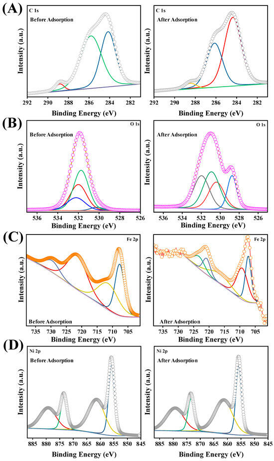 XPS of RGO-NiFe2O3-SiO2-PIn NCs before and after adsorption of Sb(III): (A) C 1s, (B) O 1s, (C) Fe 2p, (D) Ni 2p, (E) Si 2p, (F) N 1s, (G) Sb 3d.