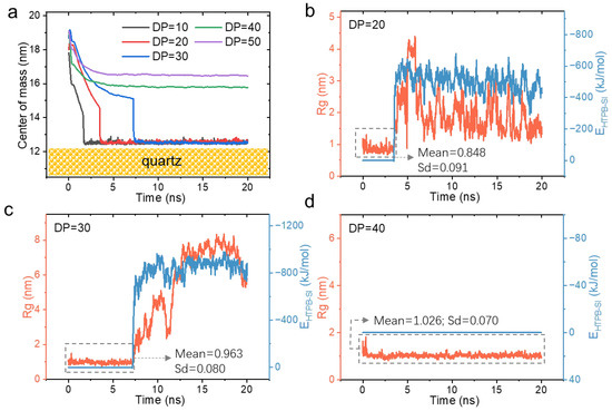 The competition between conformational entropy and adsorption enthalpy offers potential strategies for regulating the surface wetting of HTPB. One approach is to manipulate the conformational entropy of the HTPB molecule, which increases with higher degrees of polymerization [30,45]. Therefore, independent simulations were conducted using HTPB with varying degrees of polymerization, including DP = 10, 20, 30, 40, and 50. Interestingly, Figure 4a reveals a strong length dependence in the surface wetting process of HTPB. Specifically, HTPB with lower degrees of polymerization (e.g., DP ≤ 30) exhibits rapid substrate adsorption within several nanoseconds. Moreover, as the DP increases, the time required for adsorption is significantly prolonged, indicating increased difficulty in surface adsorption for polymers with higher DPs. The previous MD simulations have demonstrated that reducing the chain length is advantageous for the movement of the contact line of n-alkane on α-quartz, thereby confirming an improvement in wettability [37]. Furthermore, experimental measurements of the wetting time validate the finding that aqueous solutions of surfactants achieve optimal wettability with the shortest alkyl chain length in the molecule [46]. Notably, when considering considerably larger DPs (e.g., DP ≥ 40), spontaneous surface adsorption becomes notably more challenging even after extending the simulation time to 40 ns. For molecules with a higher degree of polymerization, both the Rg and the EHTPB-SI (i.e., the interaction energy between HTPB and the quartz surface) increase (Figure S2), indicating that the surface adsorption process requires the overcoming of a greater conformational entropy. These results demonstrate that effective regulation of the surface wetting effect can be achieved by controlling the degree of molecular polymerization.