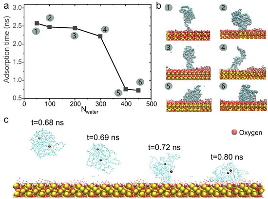 Another approach involves regulating the adsorption enthalpy between HTPB and the substrate during their interactions. To demonstrate this, we manipulated the quantity of interfacial water, which refers to water molecules bound to the hydrophilic surface. Water molecules can act as a medium to further enhance the affinity between the substrate surface and the polymer [47]. In this study, we investigated representative wetting processes of HTPB with DP = 50 by varying the amount of interfacial water (Nwater). As depicted in Figure 5a, it was observed that an increase in interfacial water leads to easier surface adsorption of the polymer, as evidenced by a reduction in HTPB’s adsorption time. Therefore, our findings suggest that interfacial water plays a beneficial role in promoting surface wetting of the HTPB polymer.