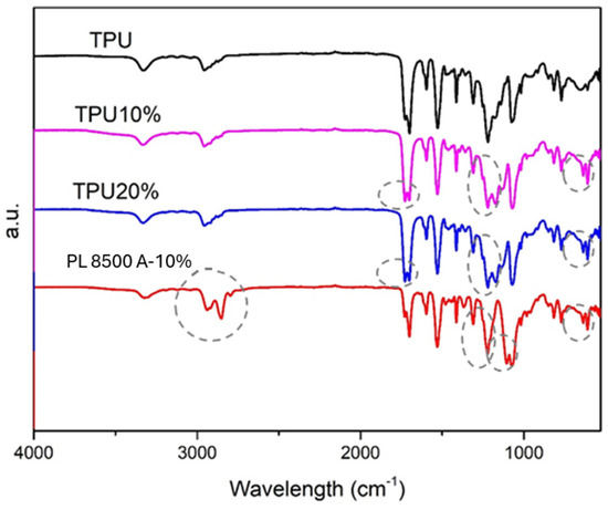The FTIR spectra of the TPU and the nanocomposites are presented in Figure 2.