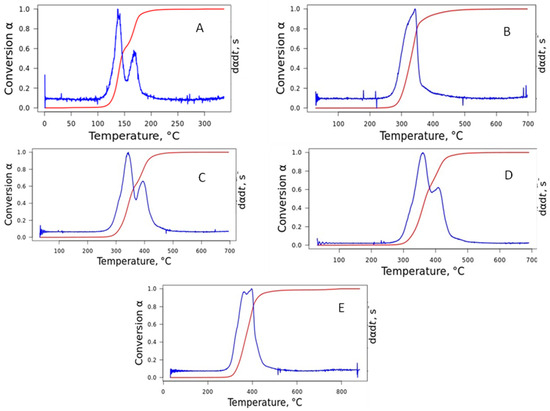 Conversion rate of the TPU at different heating rates: (A) 2 °C·min−1; (B) 5 °C·min−1; (C) 10 °C·min−1; (D) 20 °C·min−1; and (E) 40 °C·min−1.