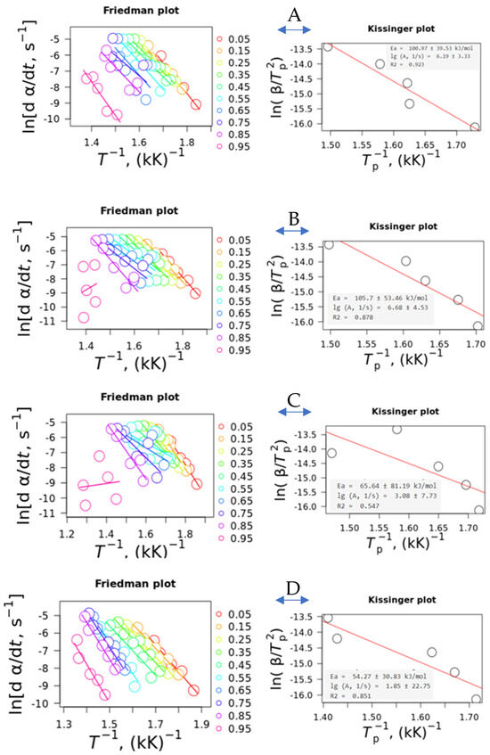 Friedman and Kissinger plots for: (A) TPU; (B) TPU10%; (C) TPU20%; and (D) PL 8500 A-10%, respectively.