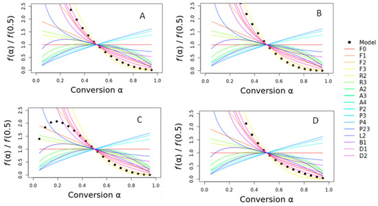 Figure 9A–D shows the following master plots for TPU and the nanocomposites, using the different theoretical models available (the circles represent the experimental fit, while the colored lines represent the following theoretical reaction mechanisms): F0: zero-order reaction; F1: first-order reaction; F2: second-order reaction; F3: third-order reaction. R2: contracting cylinder, R3: contracting sphere, A2, A3, A4—Kolmogorov–Johnson–Mehl–Avrami nucleation growth, P2, P3, P4, P23—power law, B1: classical Prout–Tompkins, D1: one-dimensional diffusion; D2: two-dimensional diffusion; D3: 3D Jander diffusion; D4: 3D Ginstling–Brounshein diffusion; L2: polymer random scission.