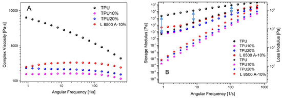 (A) Complex viscosity; and (B) storage and loss moduli of TPU, TPU10%, TPU20% and PL 8500 A-10%. The arrows are visual representations of the differences between the storage and loss moduli.